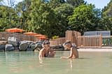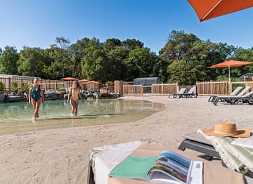 Pour le plus grand plaisir de nos vacanciers, aussi bien des petits que des grands, nous avons récemment intégré un lagon tropical à notre parc aquatique. De faible profondeur, il permet à tous de se baigner et de barboter dans une eau turquoise et dans un cadre qui rappelle forcément les tropiques ! Entouré d’une plage de sable blanc et fin, avec des palmiers et des rochers en guise de décor, notre lagon est l’un des seuls présents dans un camping en Loire Atlantique ! Venez-vous prélasser sur un transat à l’ombre d’un parasol coloré, pendant que vos bambins s’amusent dans le sable !